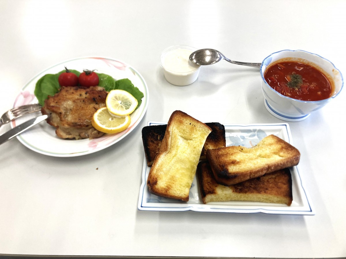 ガーリックトースト/鶏もものステーキ/トマトスープ/ヨーグルトムース(紅茶風味)