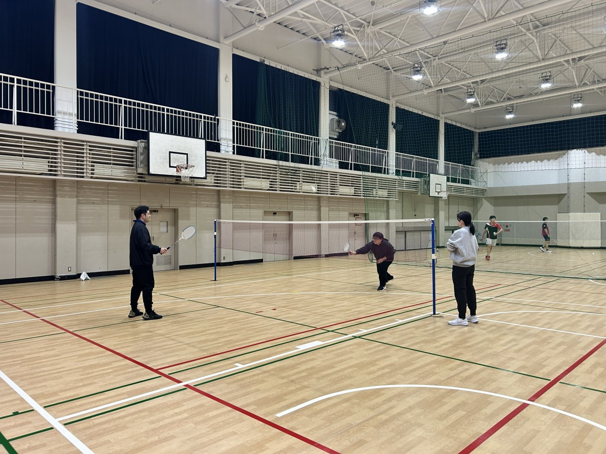 途中から照屋先生も参加し、3人でバドミントン!